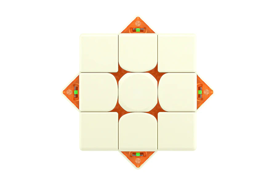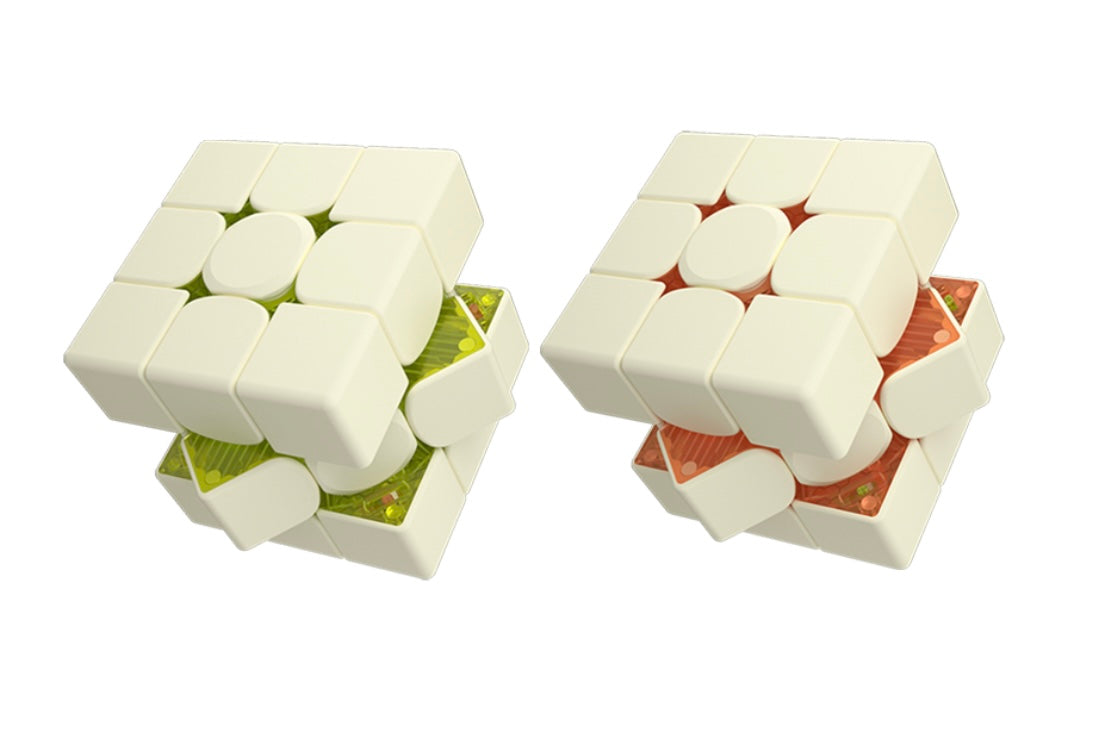This patented design by GANCube utilizes opposing magnetic repulsion which removes the spring found in a conventional speedcube.
