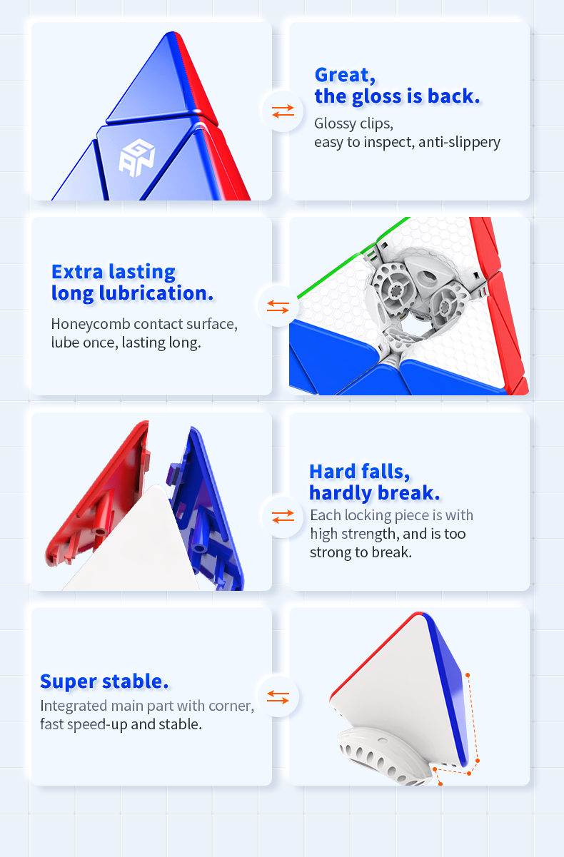 GAN Pyraminx M features a core magnetic system, making the puzzle one-of-a-kind. The GAN Pyraminx also comes with the iconic honeycomb design which provides a plush, smooth and comfortable turning experience.